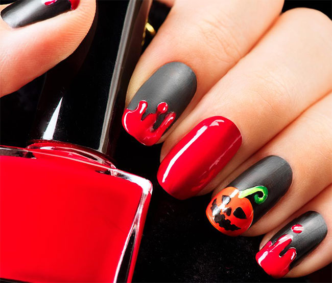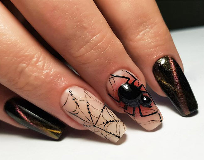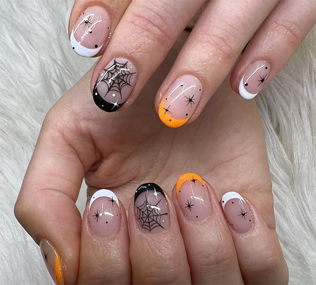 Halloween-themed nail art often incorporates the classic color palette of black, orange, purple, and green. You can use these colors as a base or in intricate designs.