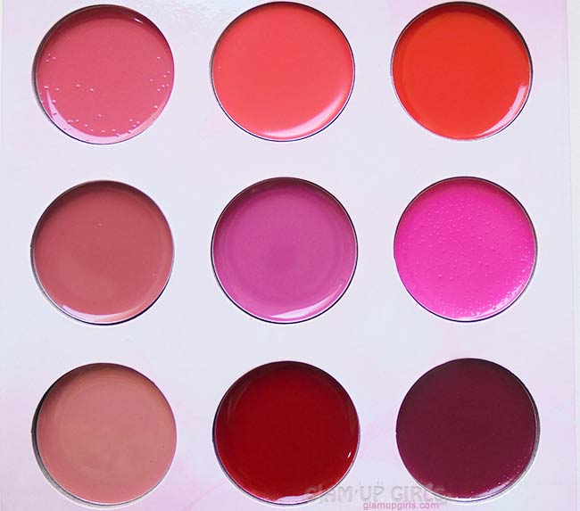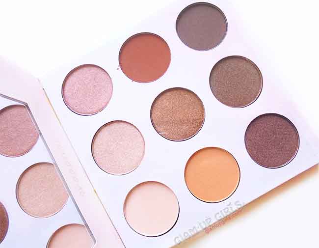 I must admit that it was its unique packaging that got me to buy this palette in first place. It has dual side light pink cardboard packaging with a handy mirror on both sides and closes perfectly with magnetic touch. This palette contains 9 eye shadows at one side and 9 lipsticks at other side. The biggest benefit of keeping both products apart is that falling powder will not spoil the creamy lipsticks.