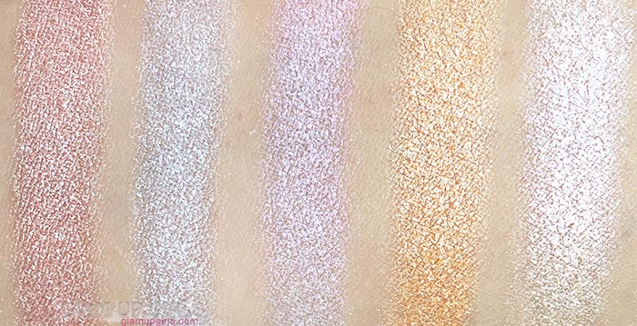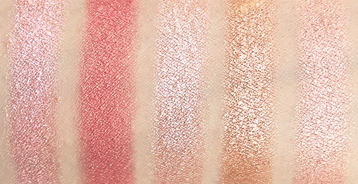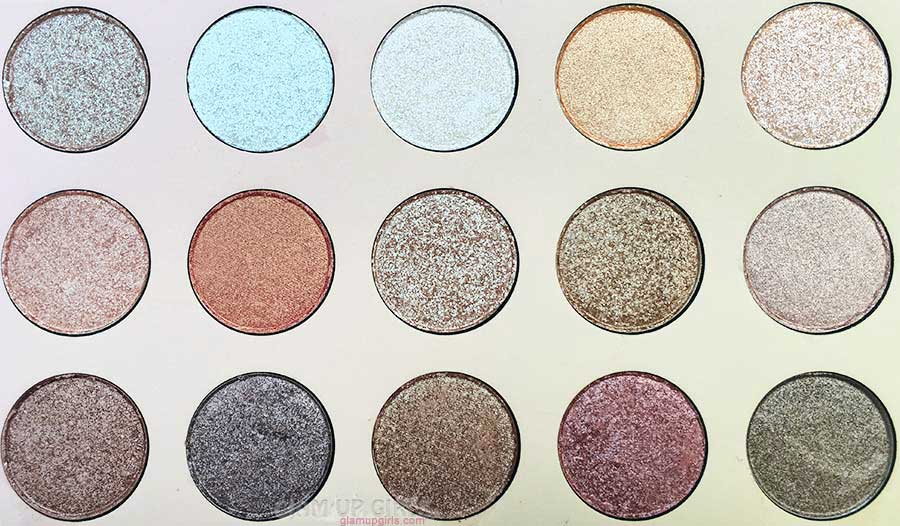 ColourPop Golden State of Mind Eyeshadow in Lust in Time, Mind Tricks, Wing Woman, Heads or Tales, Tinker TimeThis palette comes in pale yellow cardboard packaging with gold color words embossed on it. It contains 15 shimmery, frost and glittery shades. I have not noticed any chunky glitter in any shades and most of the shades have soft buttery texture which are easy to apply with very less fallout. Although shades are supposed to be applied with wet brush but i have applied it dry in above swatches and the pigmentation is really good for all shades. However when applied wet they last longer and are more intense.