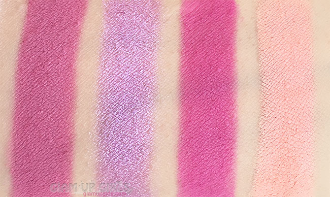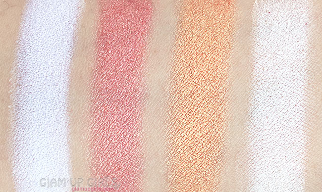 Blossom described as metallic peach with pink and gold duochrome finish. It is a coral shade with golden shimmer. It has little fallout while applying but have good pigmentation.