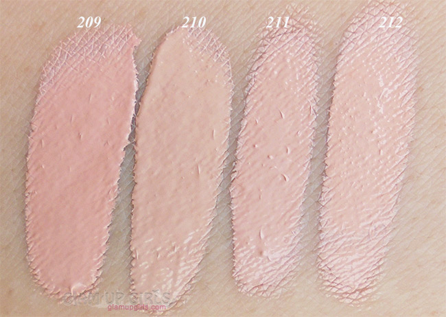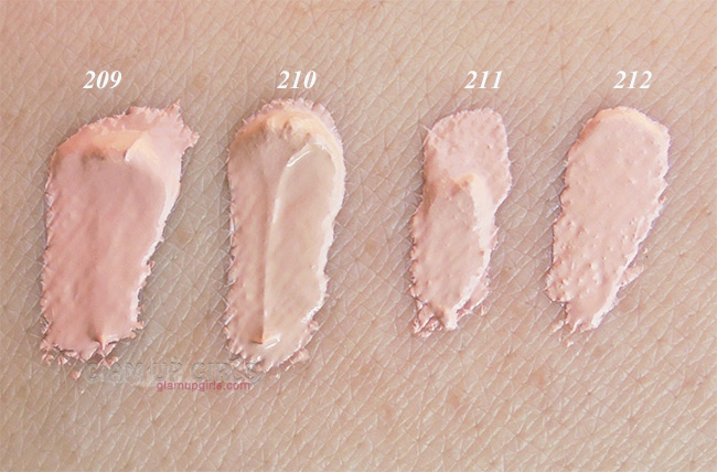 The shades i have swatched above includes 209, 210, 211 and 212. The shade range starts with very light shades with most of peach pigments considering it is European brand. The only shade with strong yellow tone is 218 which is latest addition. 209 is light peach shade, 210 is light natural beige shade, 211 is beige with cool undertones and 212 is similar like 211 with warm tones. These shades are suitable for fair to medium skin. 209 shade is perfect for ones who have dark circles and discolored skin due to sun, acne or other issues. With this shade i do not have to apply my color corrector for dark circles and i can use it as concealer for regular use. To neutralize the peach tone and set this foundation i use my favorite Kryolan yellow loose powder.