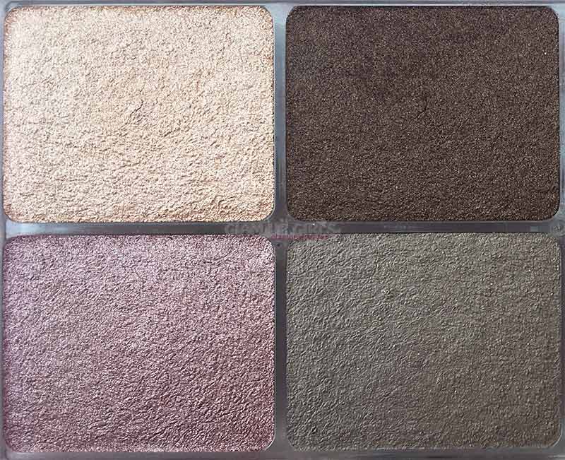 The four eyeshadows are quite useful and suitable for every skin tone. The first shade is light yellow shimmery shade to use as highlighter or inner eye area. You can also use it to pat on lid for cut crease look. the pigmentation is good and texture of shadow is also easy to blend. Second shade is dark brown shade with matte finish. It is the most pigmented shade in this palette. The texture is also good to work with. Third shade is a lovely medium lilac shade with shimmery finish. The texture and pigmentation is similar to first shade. The last shade is muted grey shade with matte finish. Its pigmentation is also good with nice formula to work with.