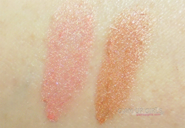 Rush Me is a shimmery peach shade with hint of pink. After blending it spreads and gives sheer application but if you want it more intense you can build it up with more drops. Malibu Ocean is a light bronze shade. It is also sheer at one application but is build able. Both shades have very fine shimmer which looks very natural and not glittery. They do not enhance pores like most powder highlighters and looks very natural. They are budge free like they claim and lasts very long almost 5 to 6 hours.