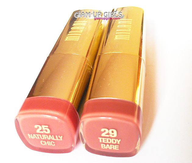 Lets praise the packaging of this lipsticks first. I love the luxurious look of these lipsticks, the shiny golden hard plastic tubes. The caps adjust firmly which are very travel friendly. At bottom a tub is attached with similar color of lipstick so you can pick the color from your lipstick stand although this packaging is will show the finger prints easily and you have wipe them away with cloth or tissue paper.
