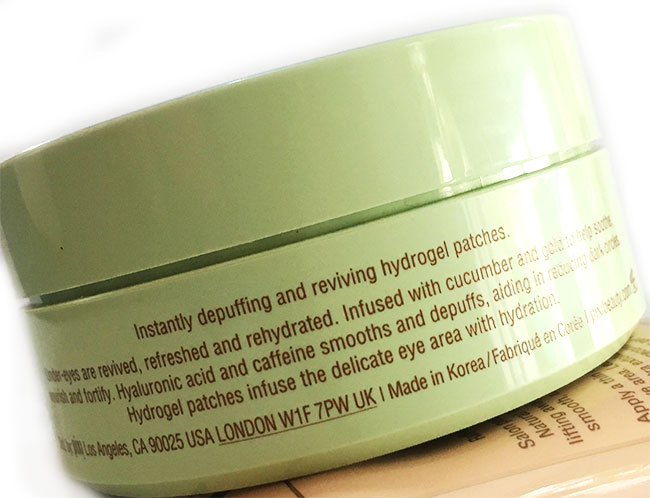 These patches come in green jar with blue twist able cap. the jar is protected by lid and have spatula in it. The patches themselves are light green sparkly sheets shaped like drops to fit beneath the eye area. They are dripped in thick serum which mainly includes hyaluronic acid for hydration and caffeine to depuff. There is no noticeable smell which is huge plus. The hydrogel patches are not too thick to be uncomfortable on skin and not too thin to easily tear but still be careful to apply them as they are soft and tear-able.