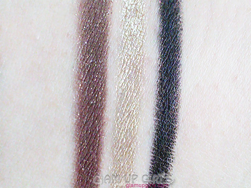 Balance is a chocolate brown shade with shimmery finish. It is very good pigmented. On hand in one swipe it is very opaque but on eyes you have to apply it two to three times to get good color payoff. Enlighten is soft gold shade with shimmery finish. It's performance is similar to Balance, in one swipe it is less pigmented but is build able to intense color. To get neat application wait first layer to dry and then apply 2nd layer if you are using it as eyeliner. Boost is rich black shade with matte finish. It is highly pigmented and with just one swipe it gives an intense color. All shades work on eye shadows, so you can use them after your eye makeup as well.