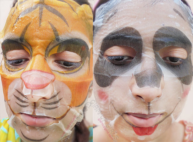 Xilix Panda animal whitening mask sheet, Tiger animal wrinkle mask sheet and Money Deep AQUA Moisture MaskThe Xilix masks come in grey-black foil packaging while SOC masks comes in cute cutting and foil packaging. The fiber masks dripped in serum are folded and secured in this packaging. They have very nice noticeable smell which is not overpowering and feels refreshing. The animal shapes are beautifully printed on these masks which look really cute. The good thing about them that the prints are made with natural ingredients and are non toxic.
